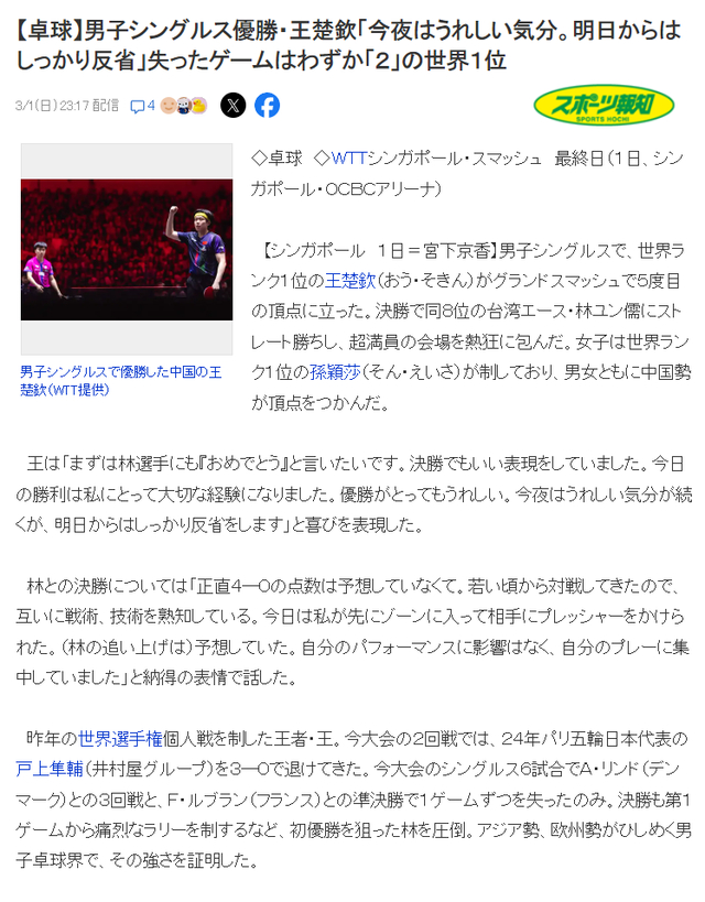 日媒也报道王楚钦这次的大满贯表现,王楚钦拿到男单冠军后说自己很高兴,但从明天开始又要重新出发,他已经稳居世界第一。